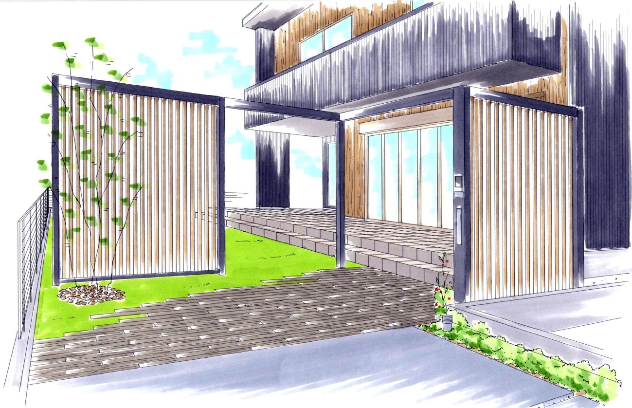 「ここが入り口かどうか?どこに行けばインターホンがあるか?」というご来客の不安要素を軽減させるために、フレームとスクリーンで緩やかにアプローチへの導線を仕切っています。