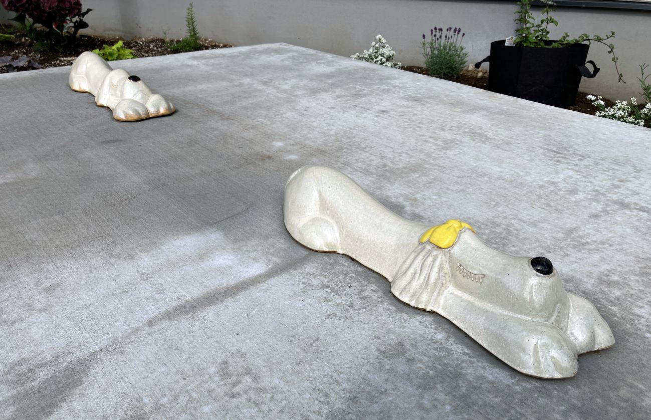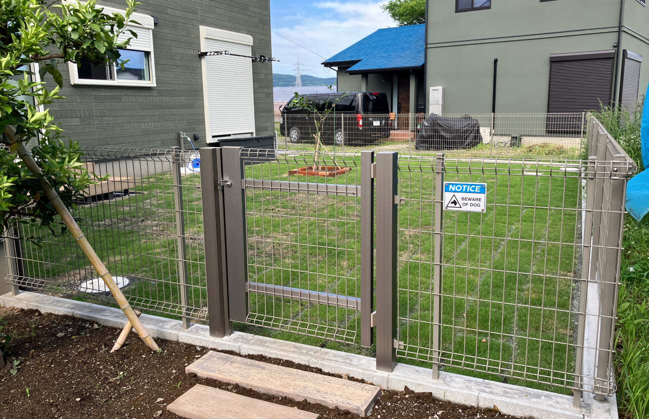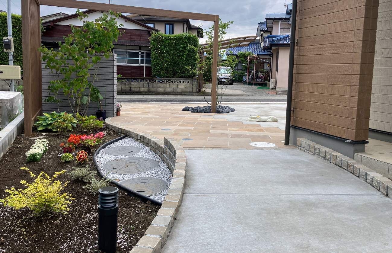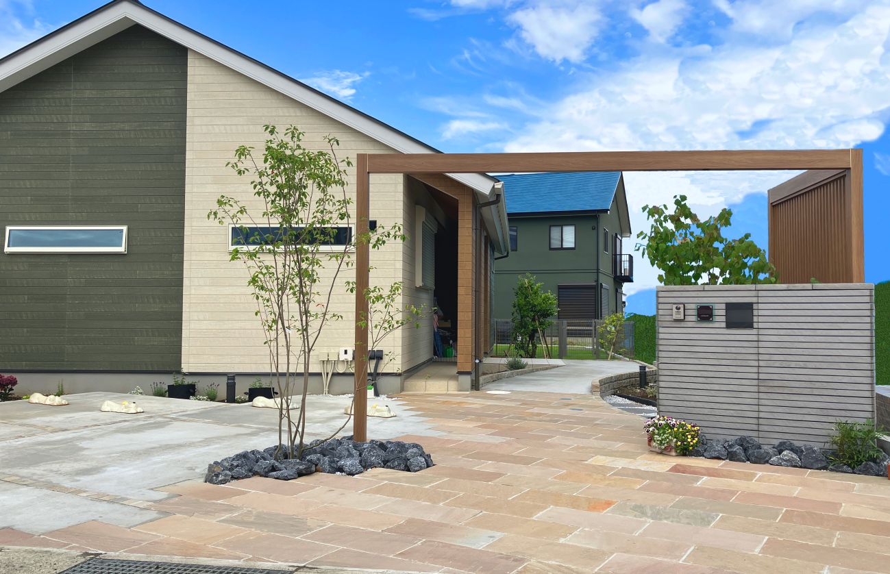 車止めに安心の「オットドッグ」、雨の日やちょっとした作業場所として活用できるサイクルポート「フーゴFミニ」を採用。角度を変えることで生まれた花壇も植栽を楽しめるスペースになります。