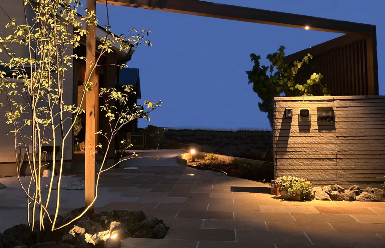 夜間は自動で照明が作動し、アプローチの演出をより引き立ててくれます。最近のオープン外構では照明を用いて防犯対策を取るのが主流となっております。