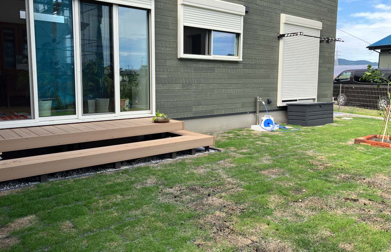 リビングと天然芝のお庭をそっと繋ぐウッドデッキは、LIXILウッドデッキDCを採用し、真夏の炎天下による高温化を大きく軽減してくれるので飼い主・わんちゃんも安心して遊ぶことが出来ます。