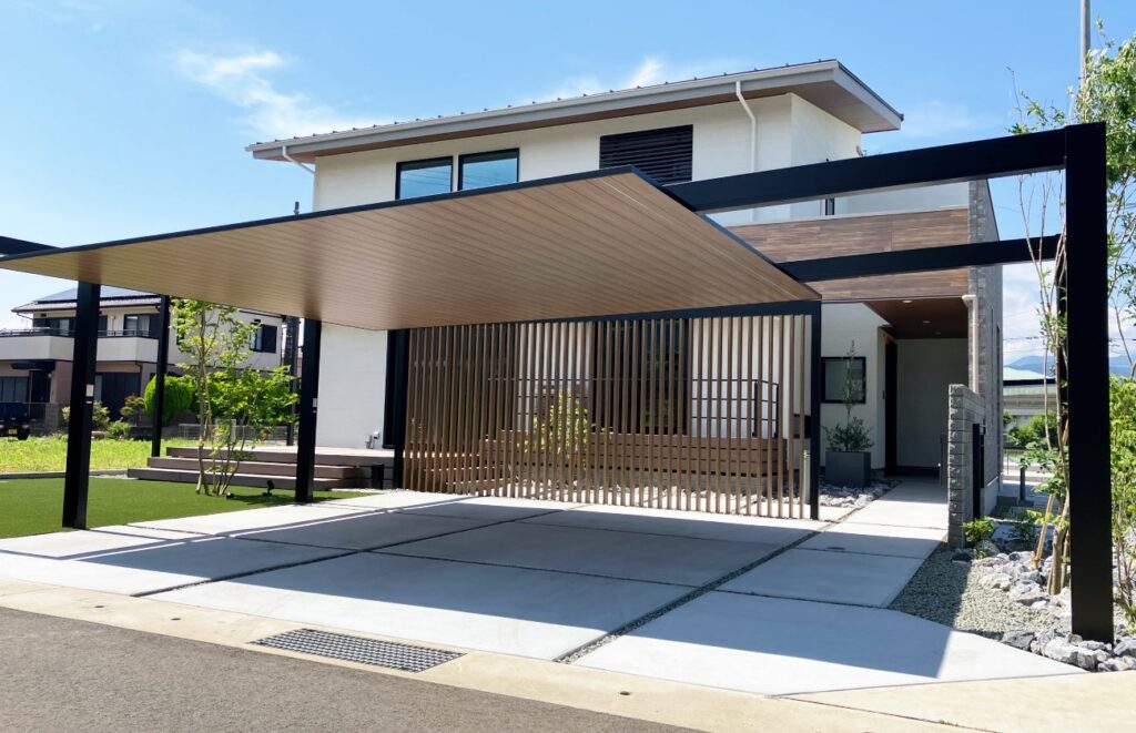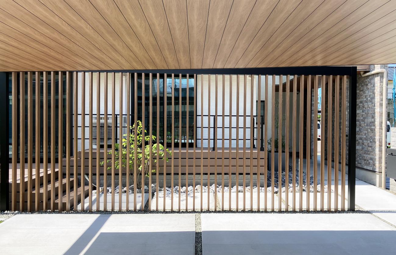 庭側正面からの目隠しとして、アルミのデザイン格子を採用しました。カーポート屋根の色と合わせることで一体感が産まれました。また、格子自体に奥行きがあるので斜めからの視線はほぼ遮ることが出来ます。