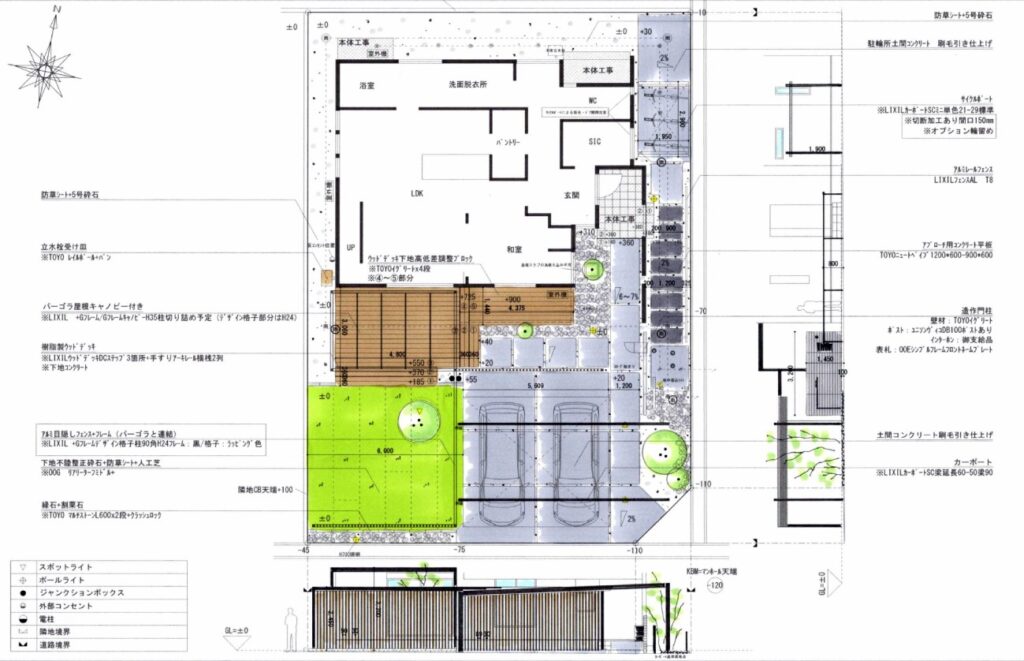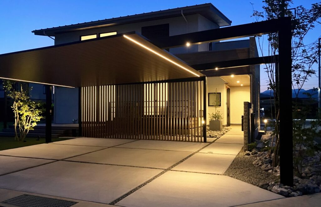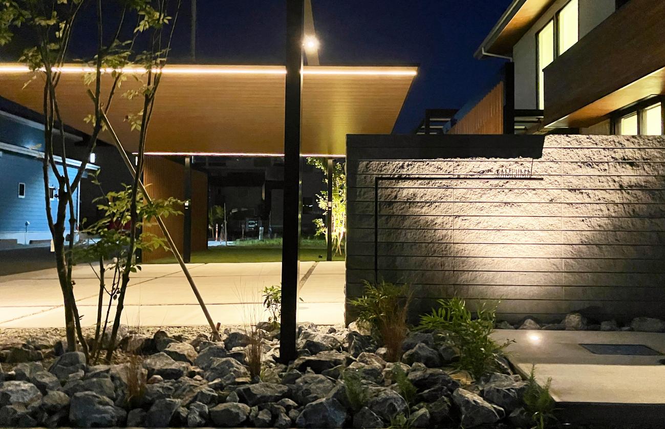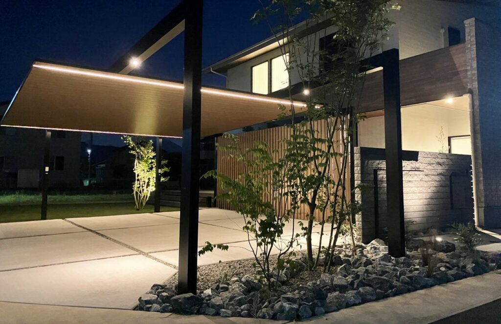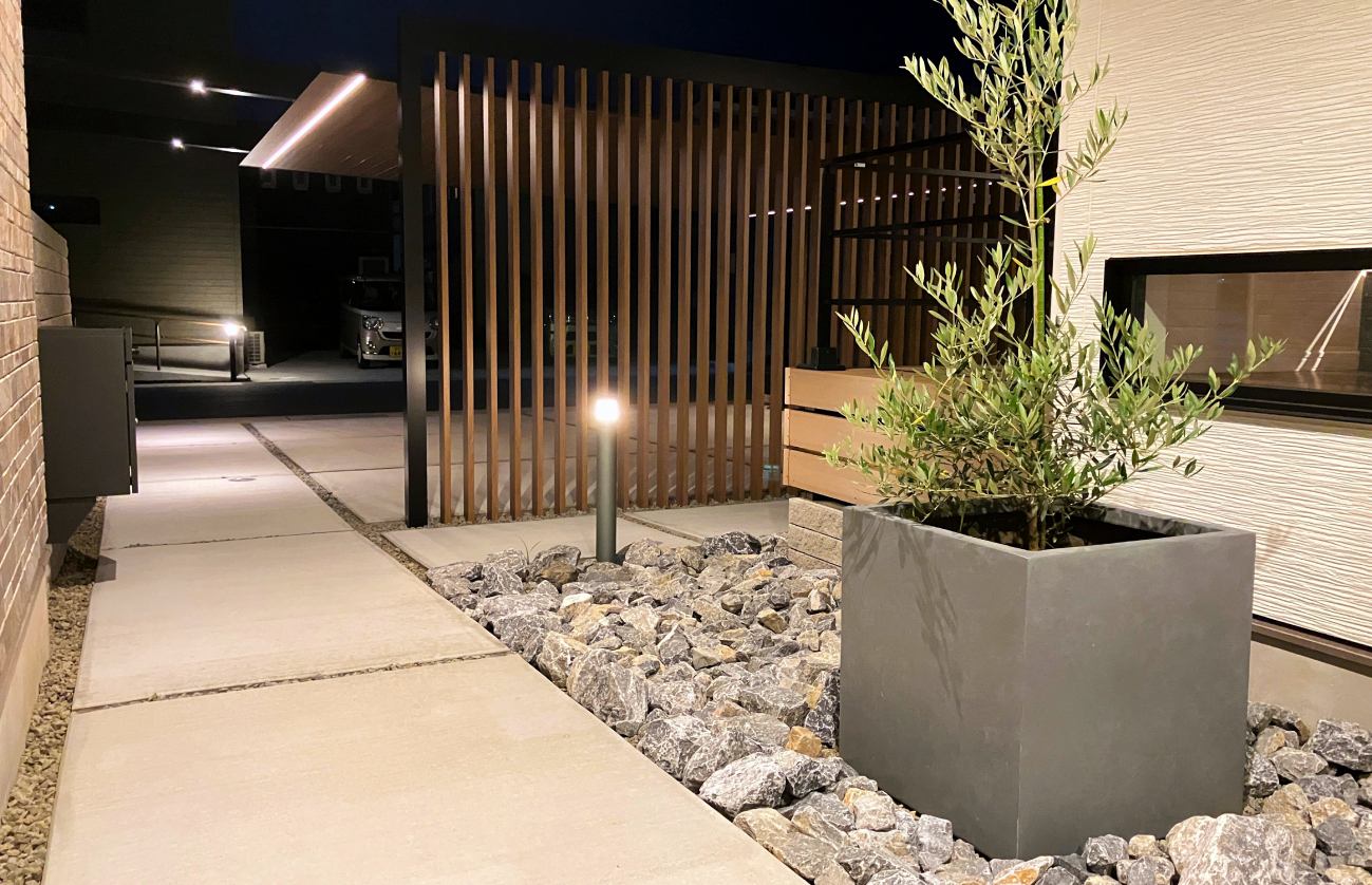採用したカーポートの柱は梁の延長により移動が可能となります。延長することで得られるものは、①車の可動域に柱がない事でスムーズに駐車ができる事、②ダウンライトを設置して夜間のアプローチの演出として活躍できることです。こちら側が施主様用のアプローチ(裏側面)となります。