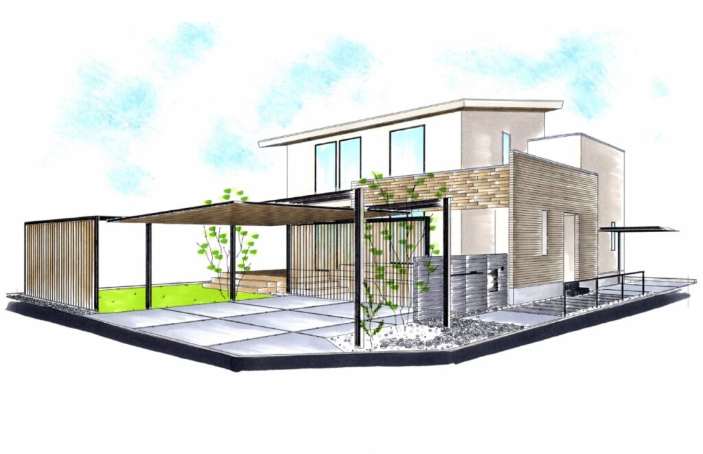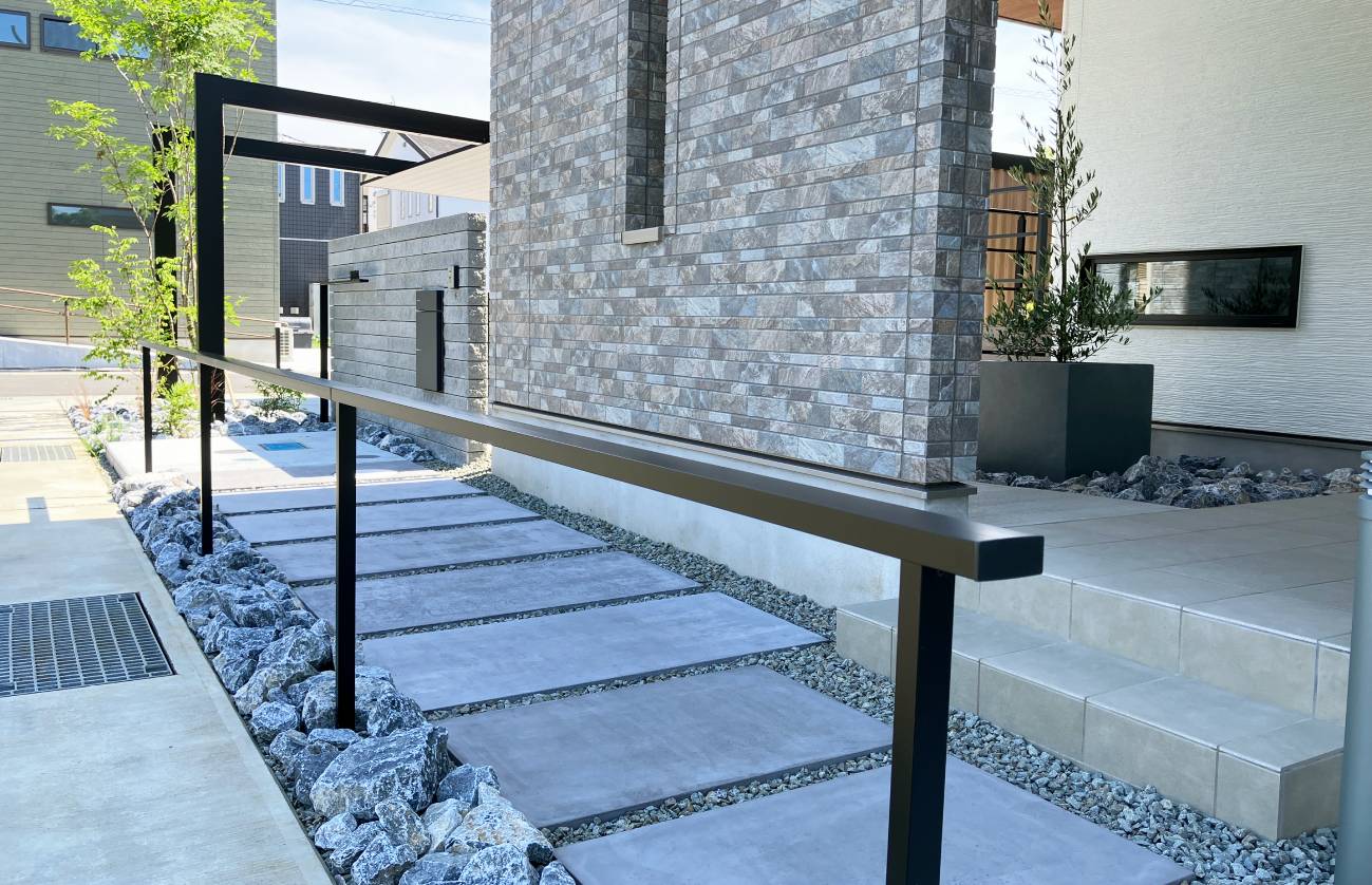アプローチ・駐車場・庭の一体感を、材料の色とアルミのフレームを繋ぐ特別な配置で演出しています。特にアプローチは2つ存在し、門柱を挟んでご来客用(正面)と施主様用(裏側面)と分けることで必然的にプライベート感が産まれています。