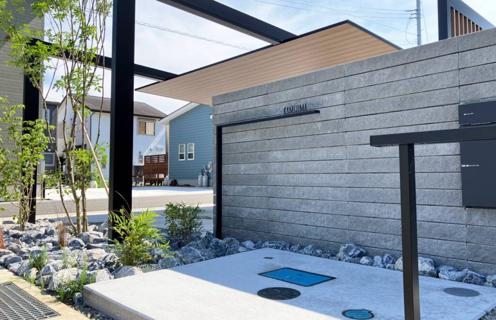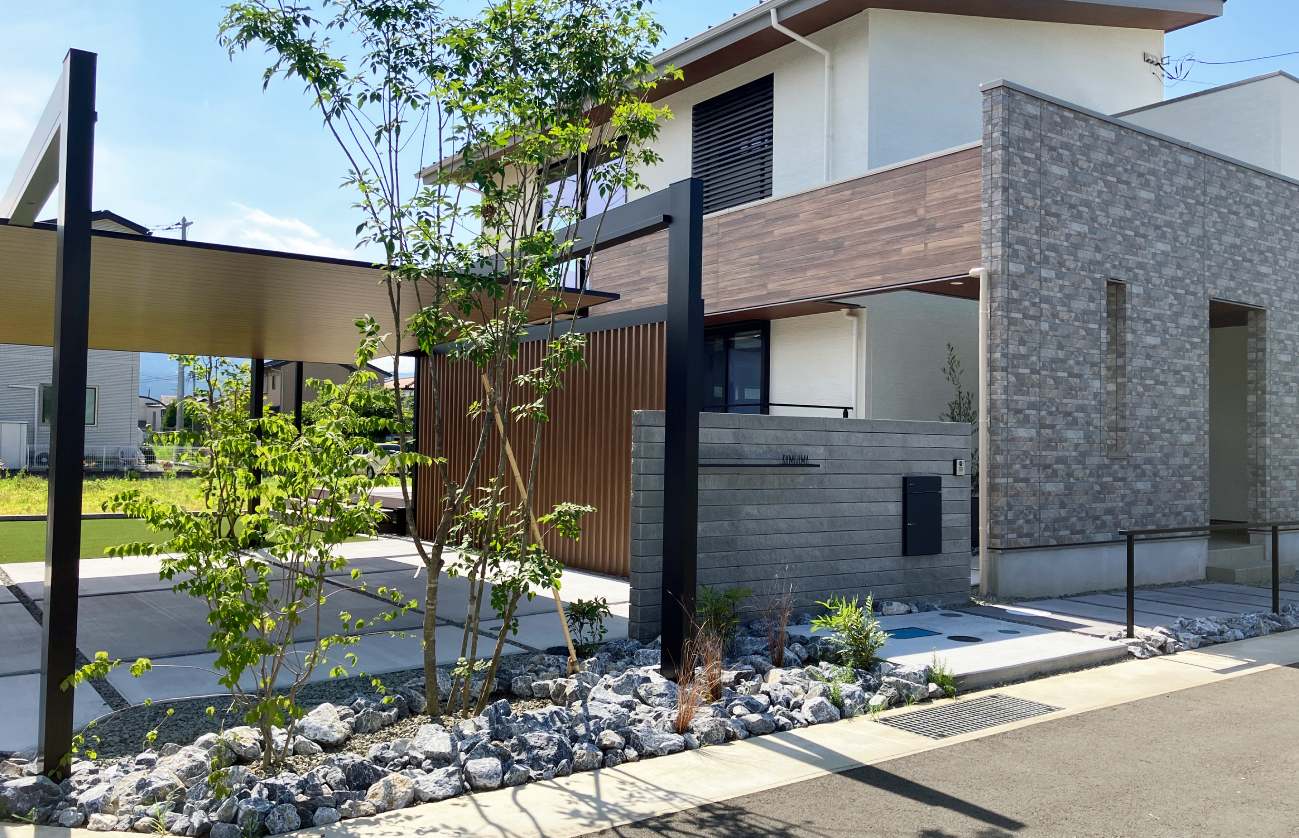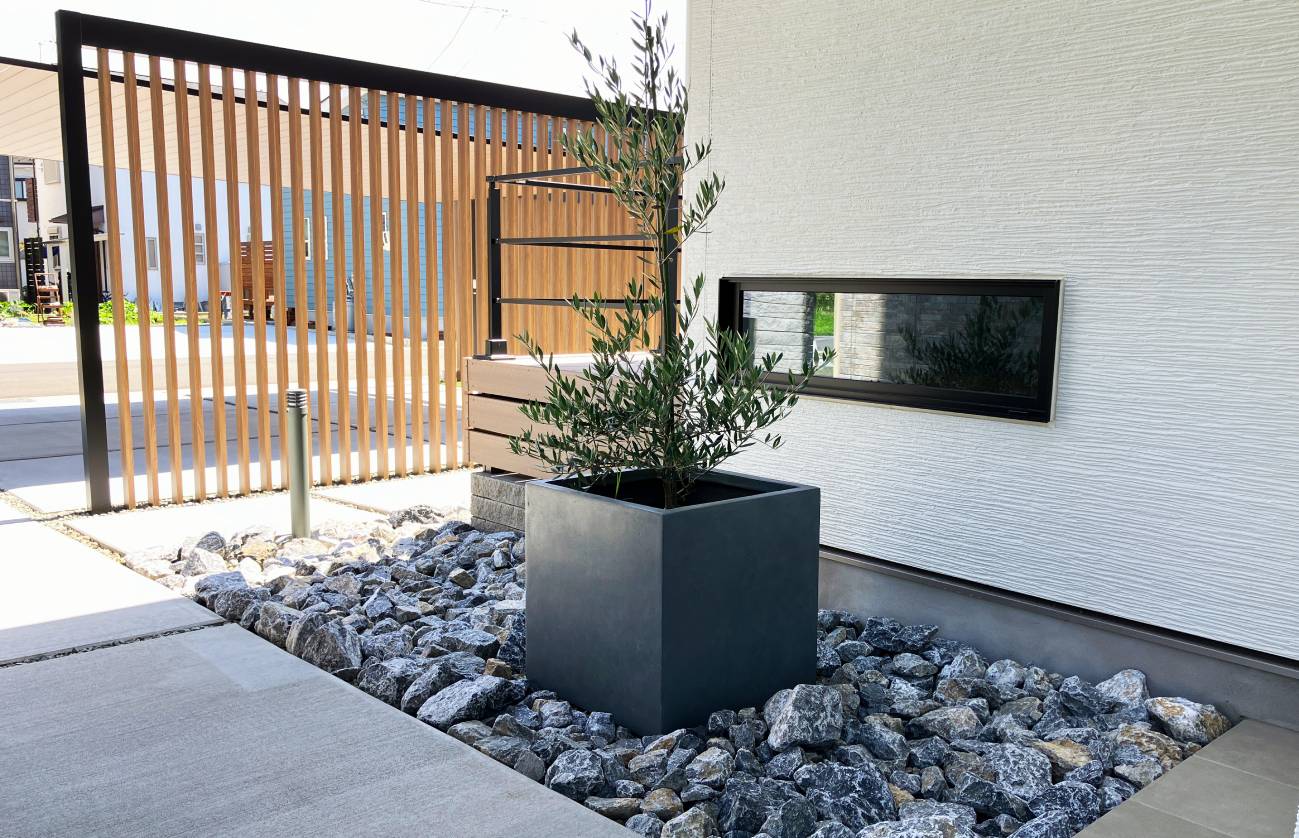 カーポートの柱が落ちるエリアには道路との干渉部分でもあるデッドスペースが産まれます。こちらには割栗石と植栽が配置され、自然石が生み出すやすらぎを感じられる、しっかりと意味もつスペースとなりました。