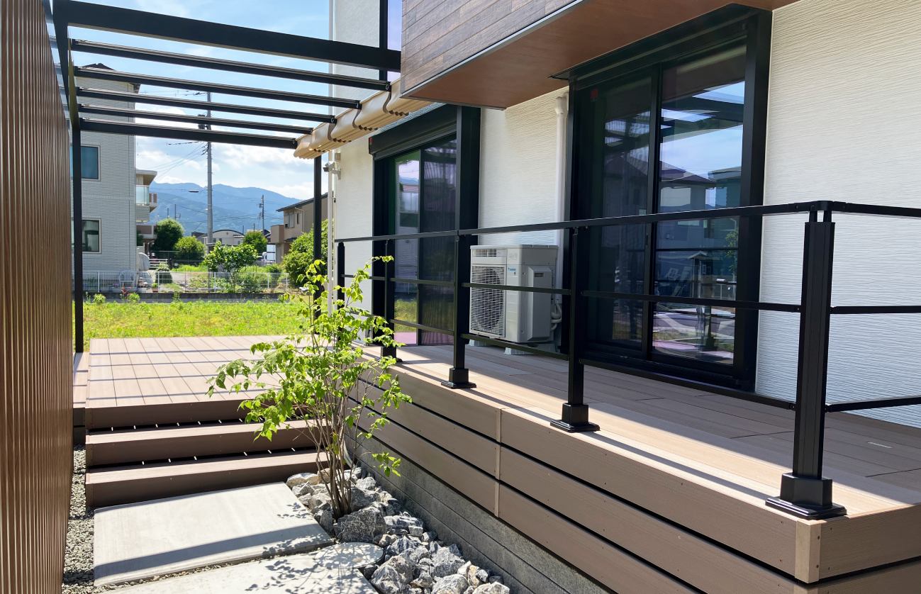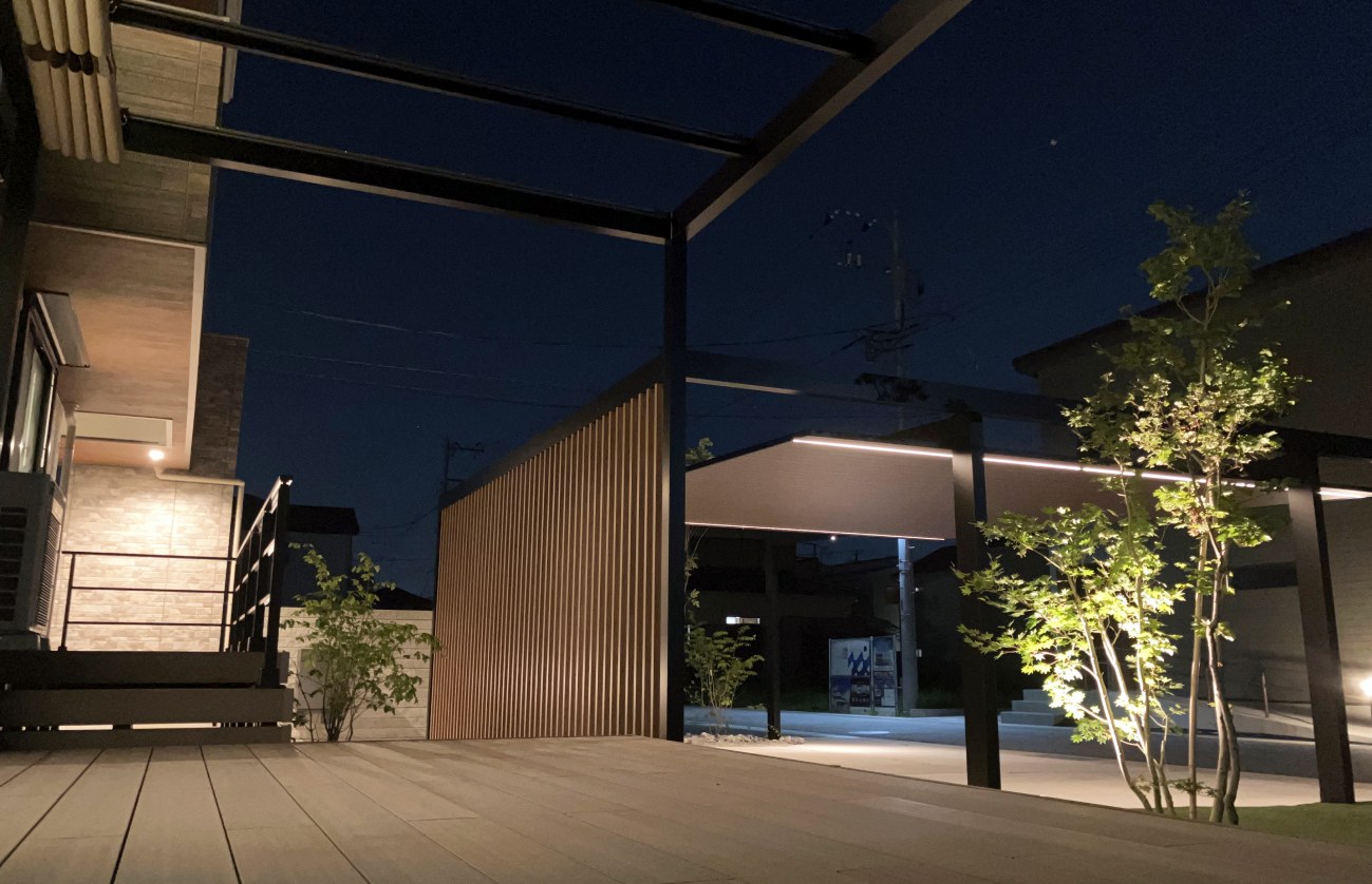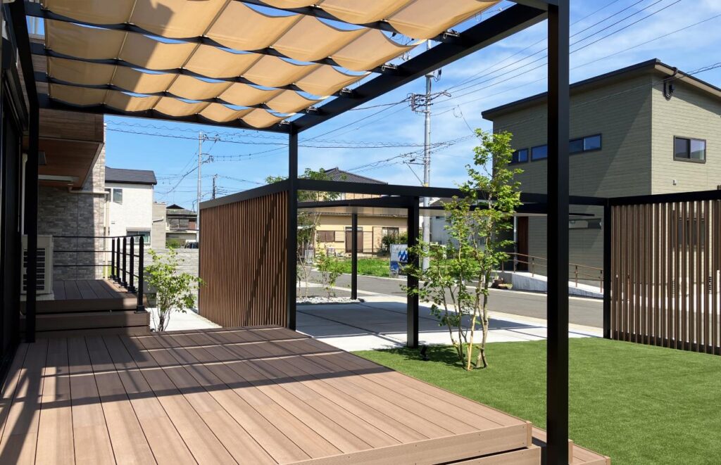 お庭のメインはウッドデッキとシェード付きパーゴラ屋根で、昼は必要な時にシェードで日差しを避け、夜は開放感のある静かな広い空間となり心ゆくまで満喫できます。